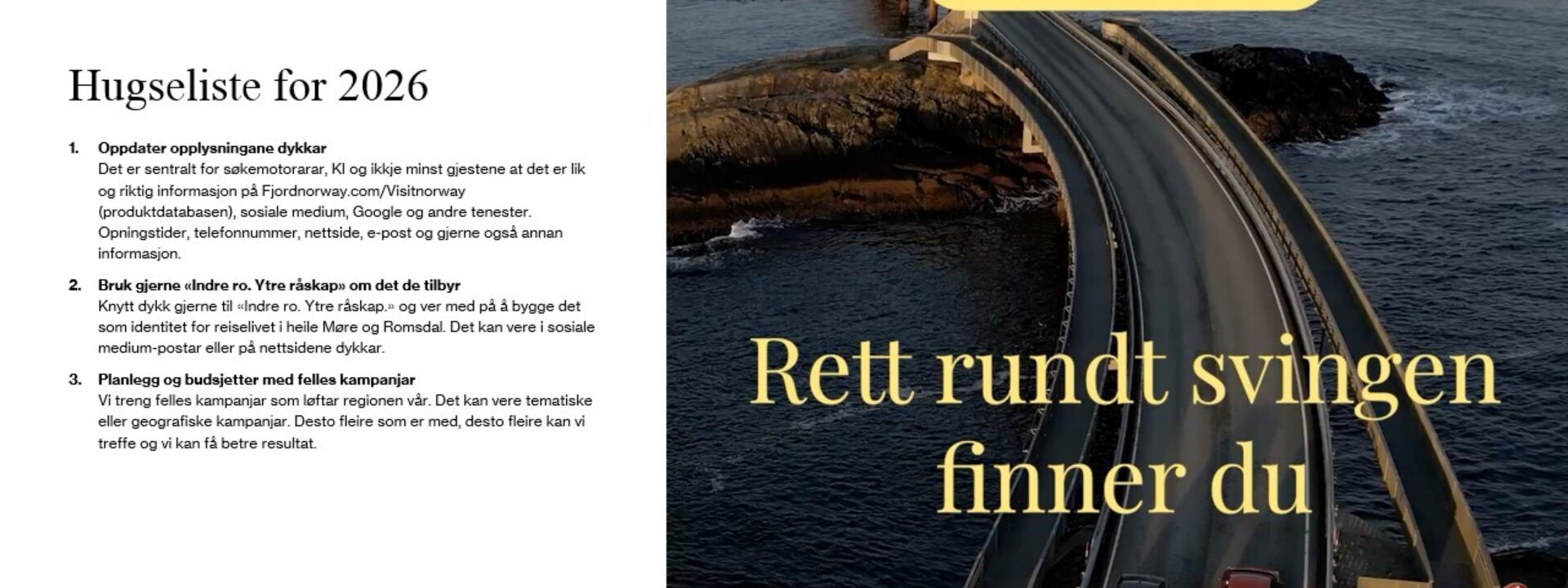 Her får du ikke bare tall – men også innsikt i hva vi gjorde, hvorfor vi gjorde det, og hva vi tar med oss videre. Du får en oversikt over virkemidler, resultater og grepene som hjelper oss å skille oss ut i et marked fullt av sterke reisemål.