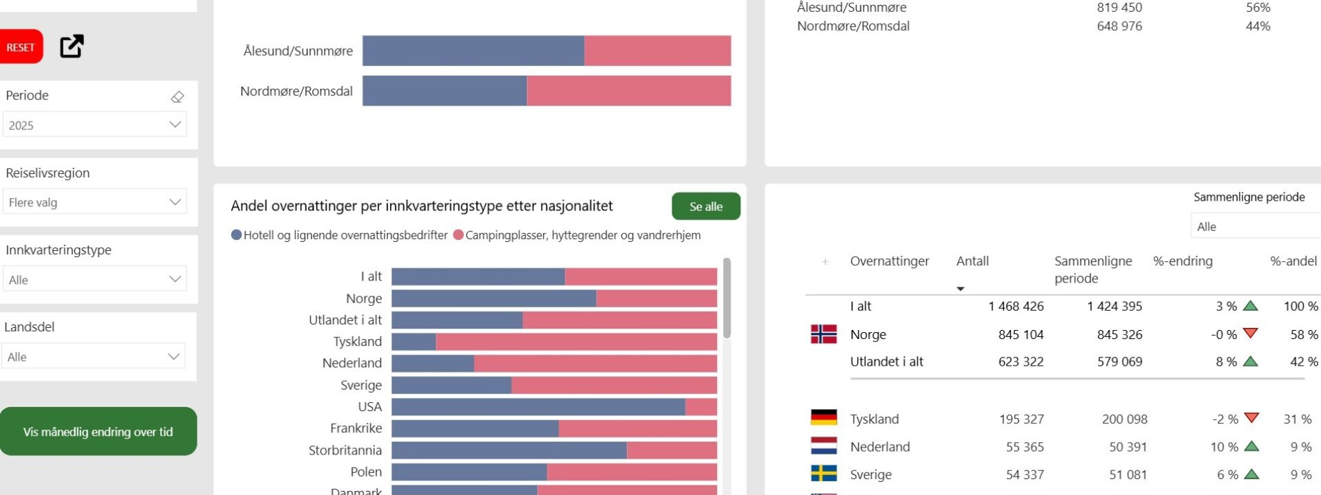 Ferske overnattingstall fra SSB for hotell, camping og hytter viser at Møre og Romsdal også sommeren 2025 øker med 3% flere overnattinger samlet sett fra norske og utenlandske gjester. I tillegg ser vi at omsetning per gjest øker også, og med allerede lave marginer i bransjen, så er dette meget godt nytt.